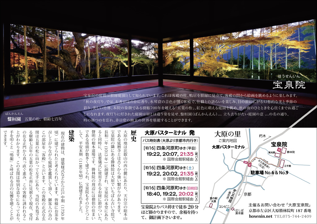 | 拝観受付時間 | 土平日:開門 17:45 受付終了 20:30 閉門 21:00 日祝日:開門 17:45 受付終了 20:00 閉門 20:30 |